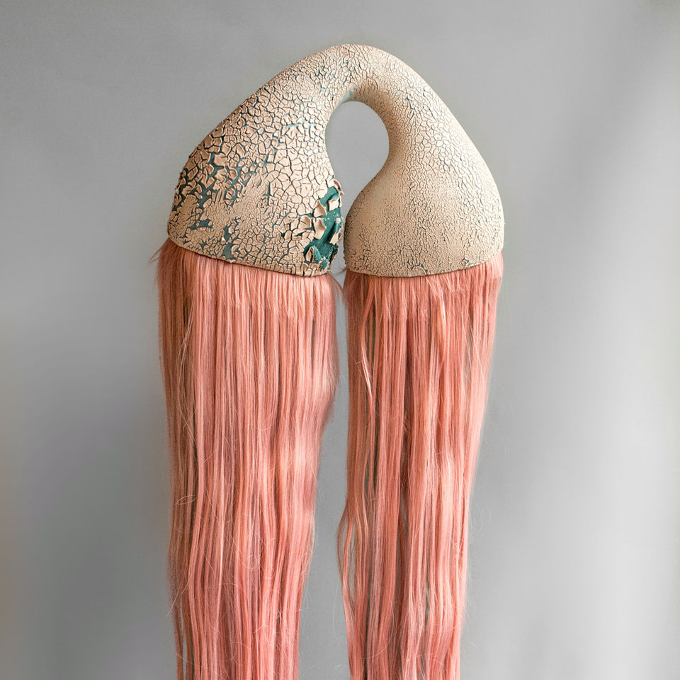 This artwork is part of the Blossom series, where the feminine curves are combined with the floral world. The form of the piece depicts a medieval beehive, coated with two honey glazes, with the glossy glaze trickling down from the cells. The inclusion of pink hair on the sculpture highlights that the worker bees are female.